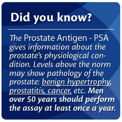 The prostate specific antigen (PSA) value is measured in the blood sample. Elevated values (more than 4ng/ml) can be an important signal for possible prostate disease. This test is designed with a limit value of 4ng/ml.